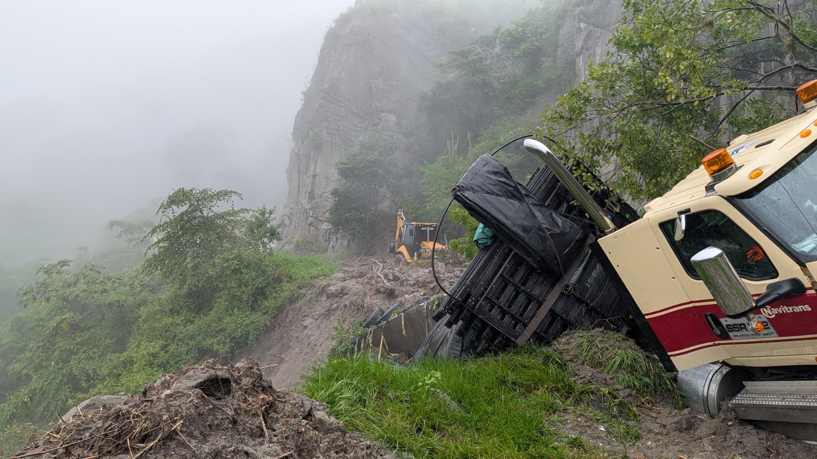 Se observan ambulancias bloqueadas en medio del lodo y un vehículo de carga a punto de voltearse en una de las curvas de la vía nacional.